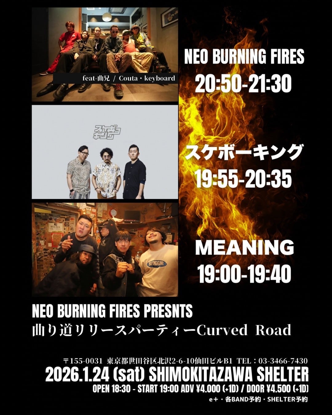 1/24(土)下北沢SHELTERNEO BURNING FIRES PRESENTS曲り道 リリースパーティ Curved RoadOPEN 18:30START 19:00ADV¥4000 / DOOR¥4500